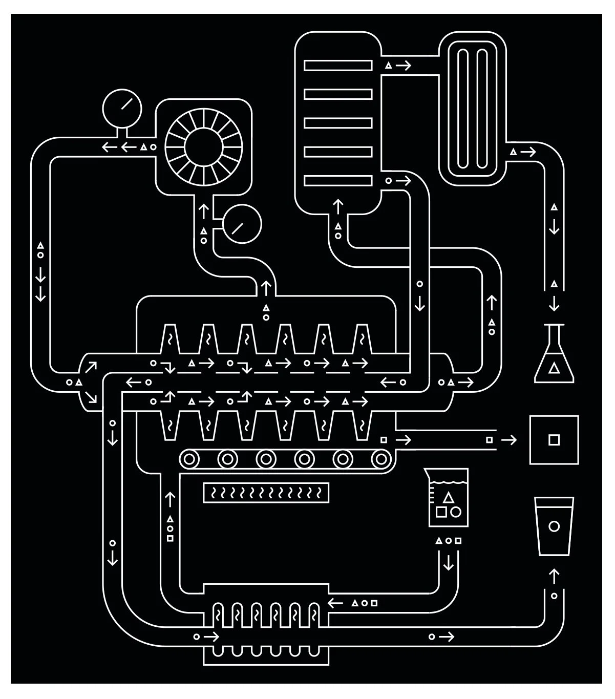 The remaining vapor moves to a distiller in the upper right part of the graphic. Here the it is separated into clean water and liquid fertilizer.